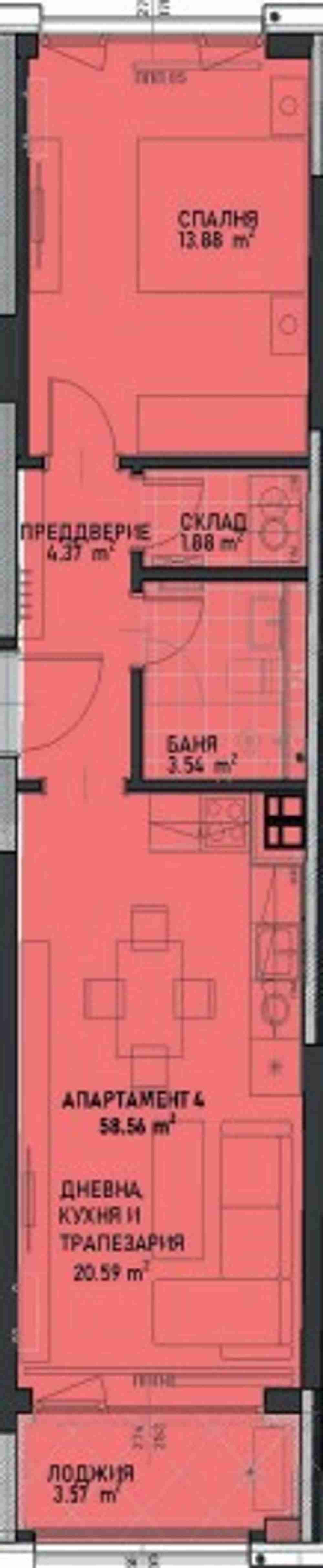 Предлагаме Ви двустаен апартамент в сградата. Обща площ 69.32кв.м. чиста площ 58.56кв.м.