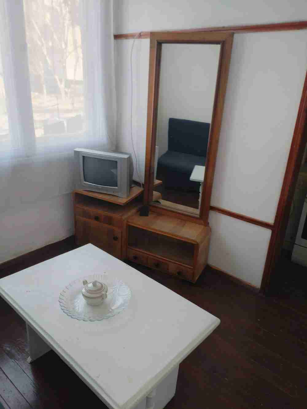 Разпределение: Кухненски бокс с трапезария, стая, санитарен възел. Подовата настилка е дюшаме, дограмата е дървена.