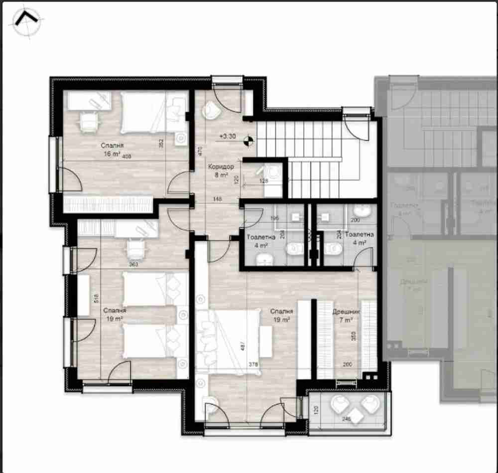 На втория етаж са разположени три просторни спални, включително родителска спалня с отделен дрешник и собствена баня с тоалетна. Другите две спални разполагат с достъп до обща баня с тоалетна. За допълнително удобство, на етажа има и практично мокро помещение. Южната тераса е идеално място за сутрешно кафе или вечерен релакс, предоставяйки красива гледка и много слънчева светлина.