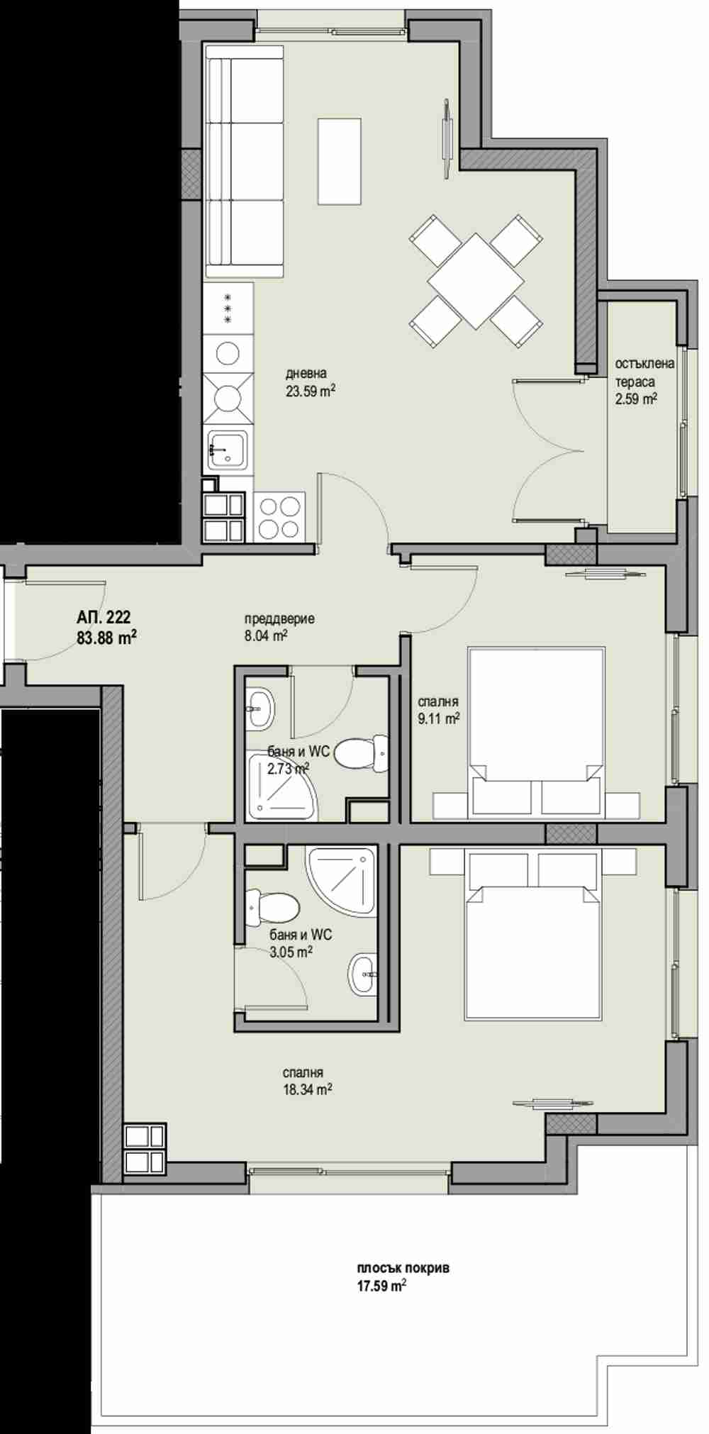 Предлагаме Ви тристаен апартамент в сградата, съответно на етаж - 5 от 6. Обща площ 103.22кв.м. чиста площ 83.88кв.м. тераса 17.59кв.м. Изложение- юг. Цената е с включено ДДС. Апартаментите се продават на шпакловка и замазка.