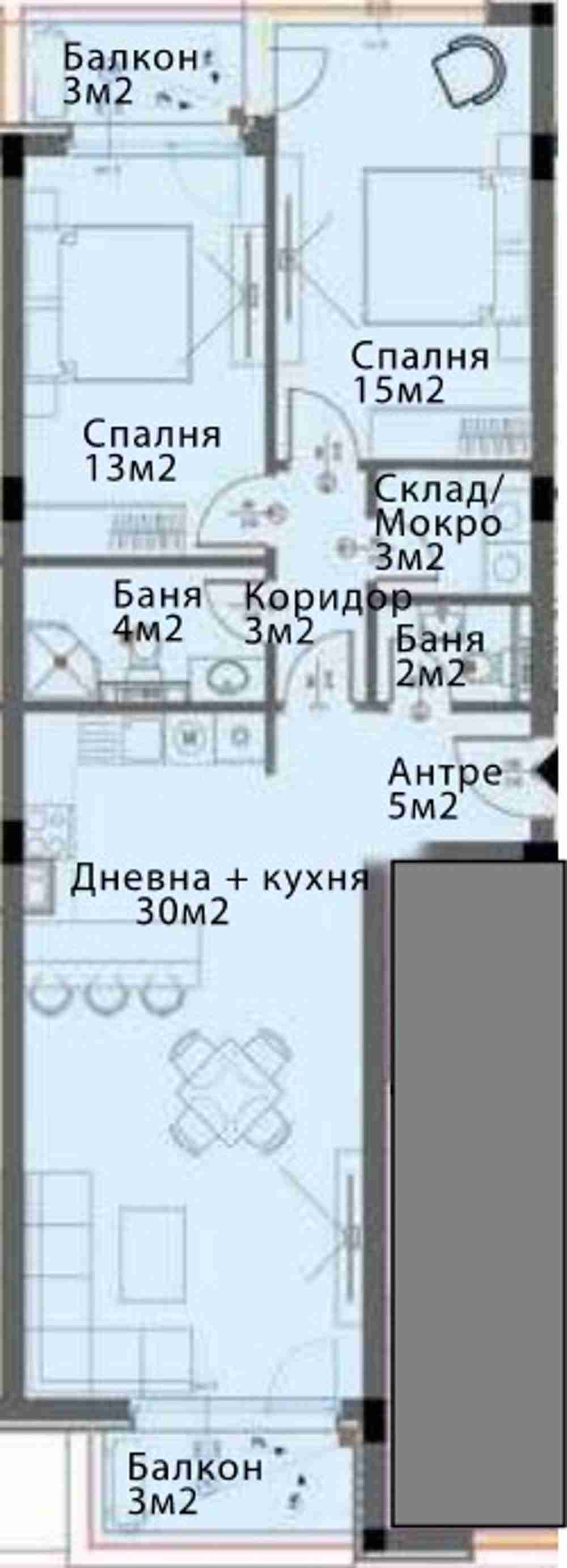 Предлагаме Ви тристаен апартамент в сграда Б и В, съответно на етаж - 2. Обща площ 114,04кв.м. чиста площ 96.60кв.м.