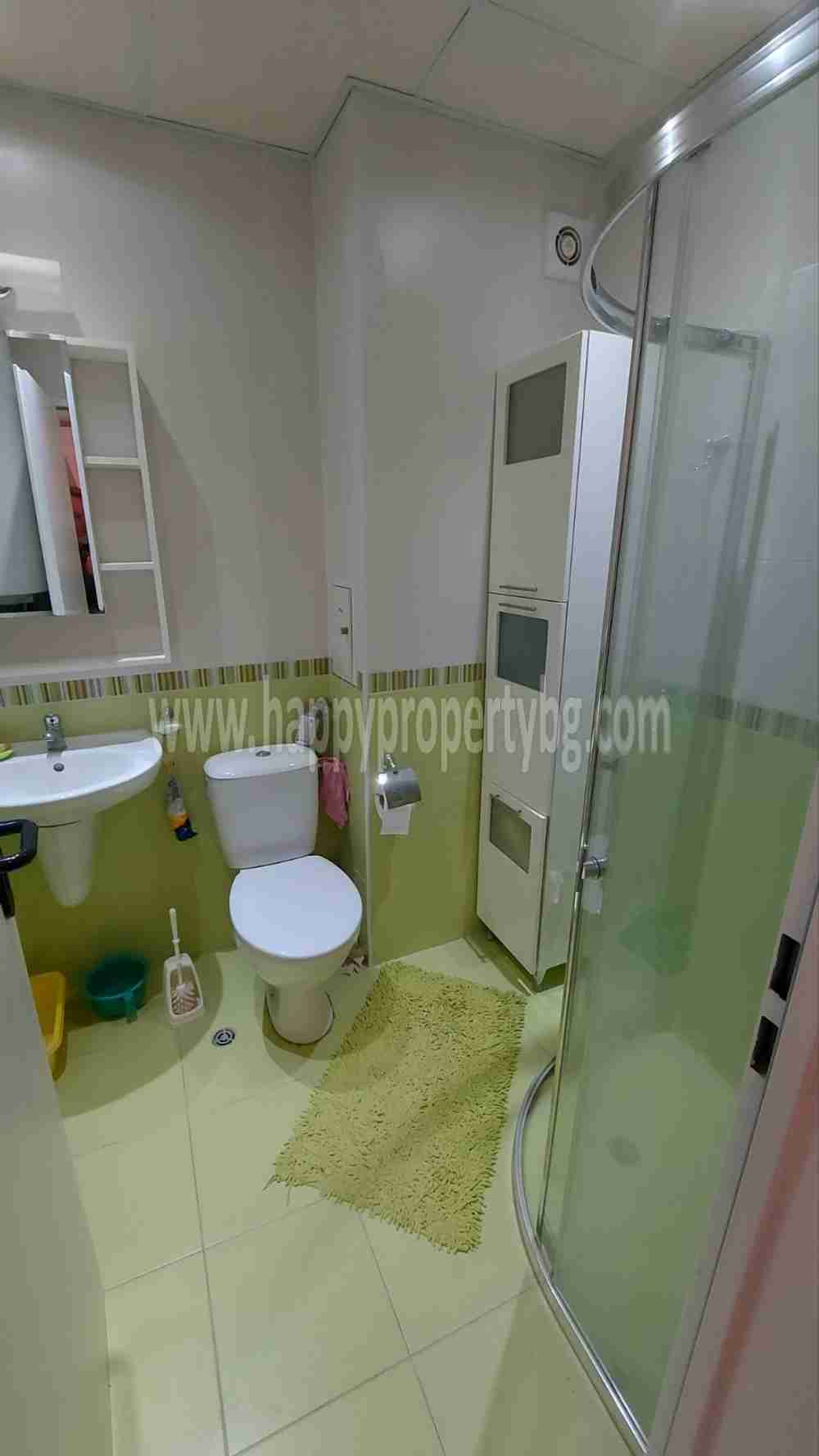 L'appartement (59 m²) est situé au 2ème étage et se répartit entre une salle à manger avec coin cuisine, une chambre, une salle de bain-WC et une terrasse. Le chauffage est avec des climatiseurs. La propriété est équipée de la télévision par câble et d'Internet. Les frais d'entretien annuels du complexe sont de 350 euros par an. La propriété est finie avec une isolation extérieure - 5 cm, menuiserie PVC VEKA.